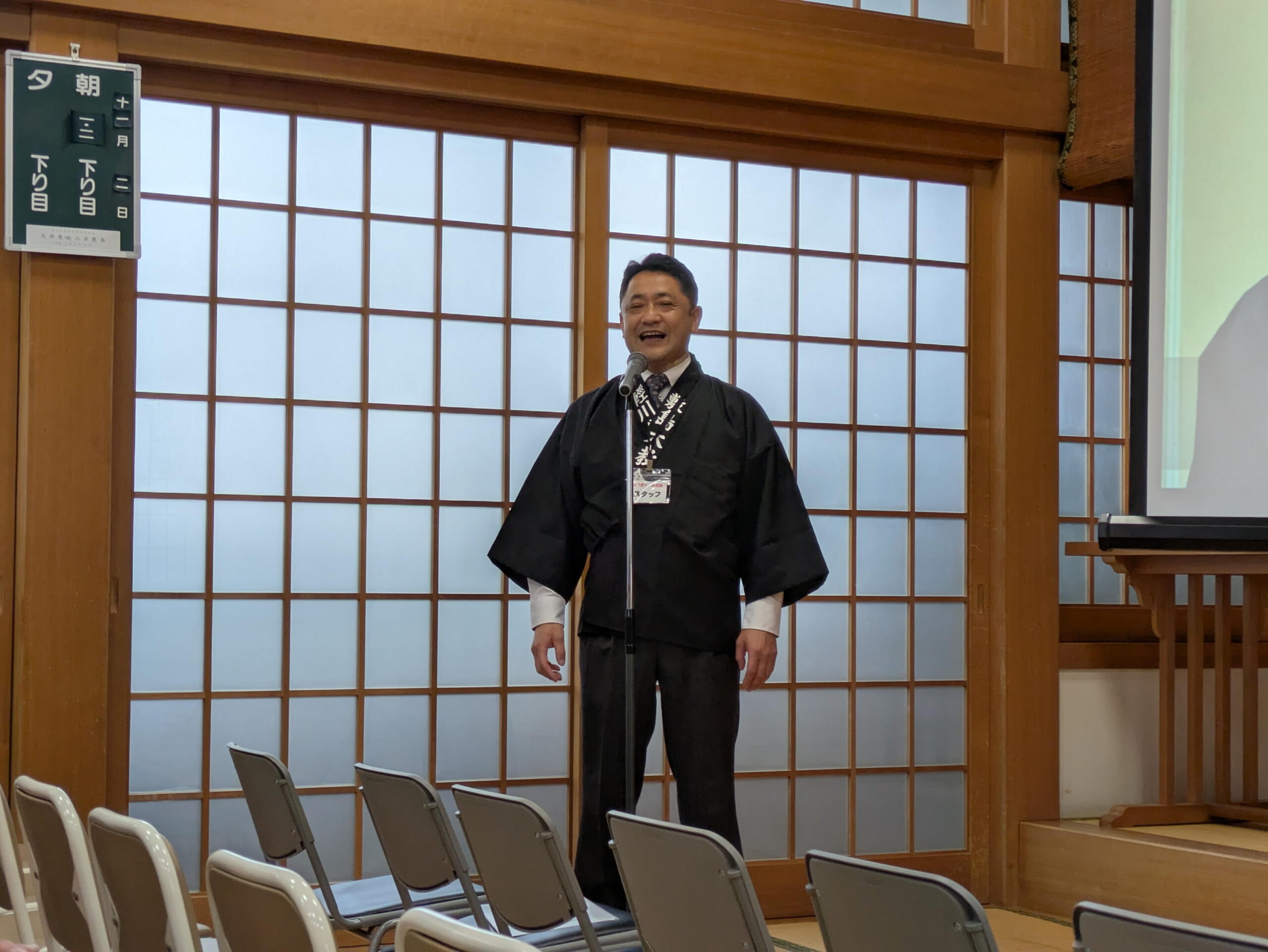 休憩を入れた後、本部准員、布教二課長、満州眞勇分教会長である村田幸喜先生が「一言のにをいがけは、人の運命を変える」をテーマに、お話になり、