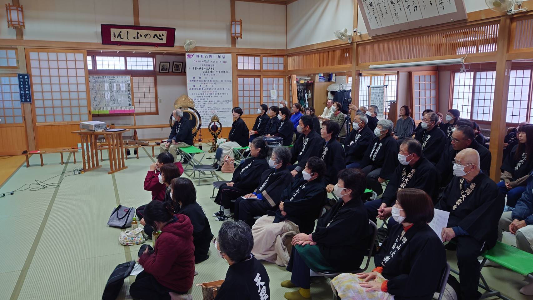 行事内容は、開会挨拶、おつとめ、諭達拝読、教会本部からのメッセージ、自主プログラムとして美唄分教会長廣岡文衛氏による「おつとめの素晴らしさ」と題しましてご講話下さいました。自らの様々な体験から「おつとめ」へ理解が深まり、「おつとめ」をつとめることが本当に有難い、素晴らしいと分かりやすく、又熱心にお話下され、受講者も頷きながら真剣に聞いておられました。その後閉会挨拶として、年祭当日まで何とか教祖にお喜びいただけるように、お互いに心を奮い起こして、心を込めて「おつとめ」をつとめ切りましょう、と誓い合い第5回ようぼく一斉活動日を終えました。悪天候の中ではありましたが、参加者は教会長23名、布教所長2名、ようぼく56名、別席運び中2名、その他13名(内少年会員11名)、合計96名の参加でありました。
